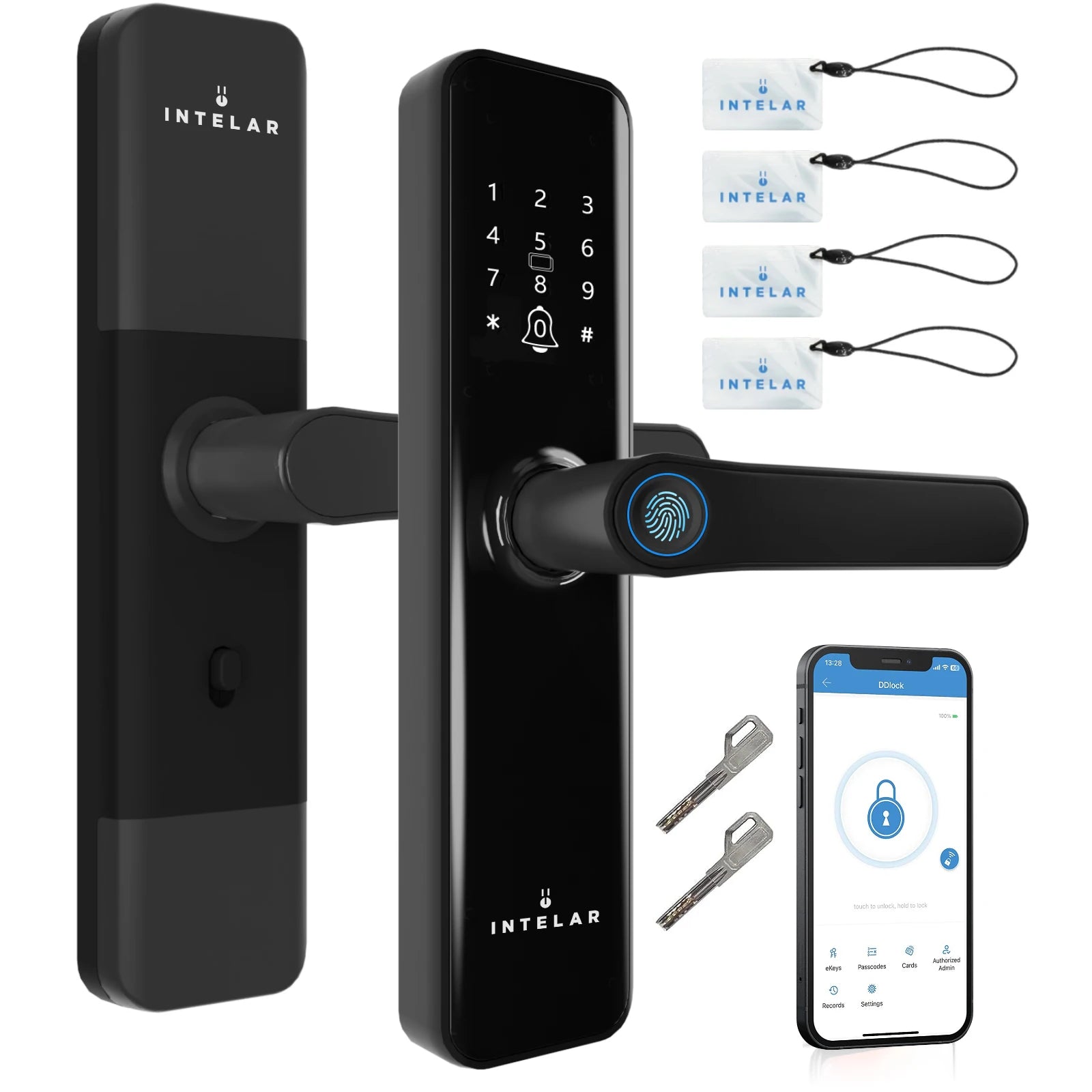 - 5 modos de acesso: App (Tuya/Smart Life), biometria (finger vein/fingerprint), senha, cartão RFID e chave mecânica